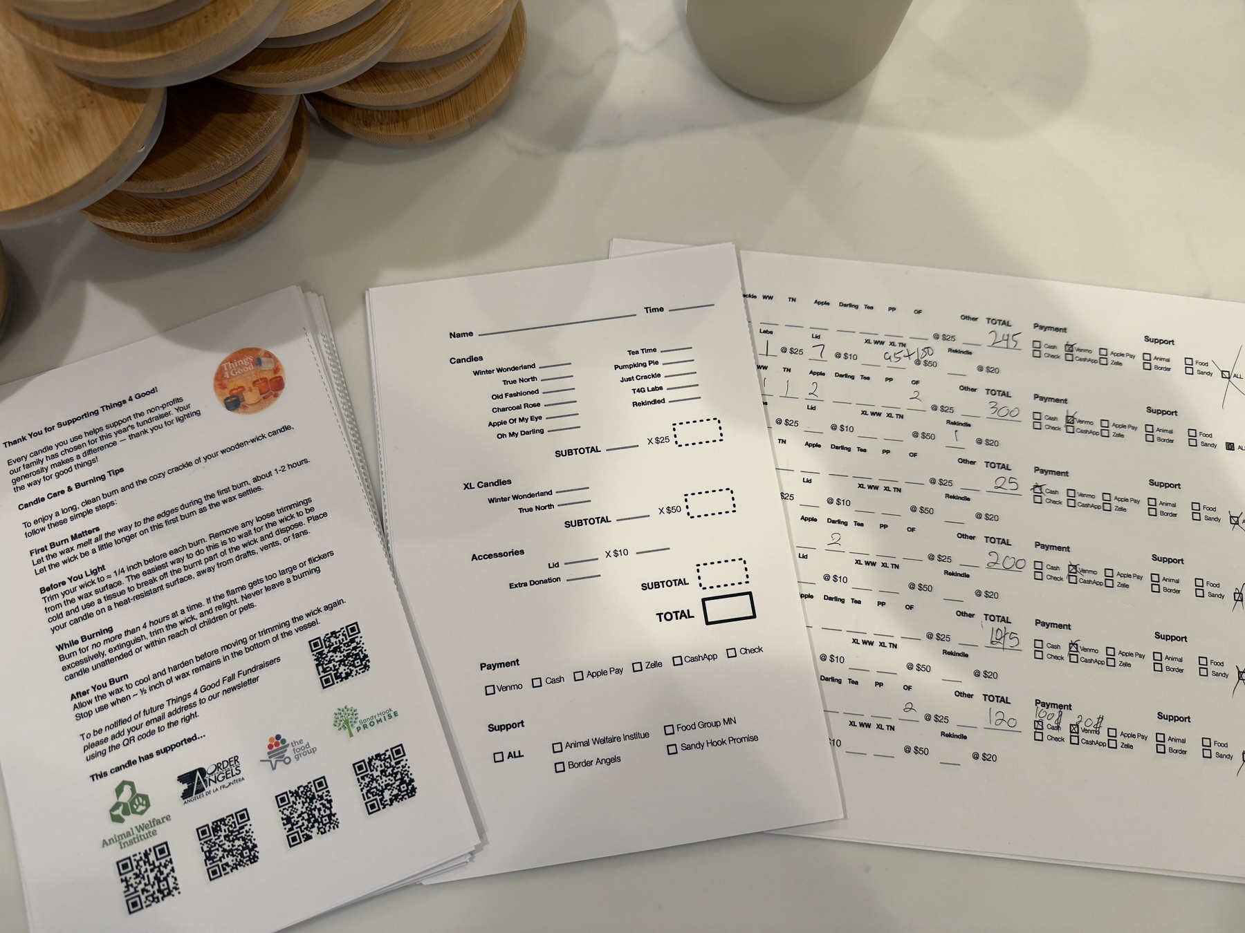 Realized we had some big usability issues in our donation tracking sheets for day 1 of Things 4 Good Candle Fundraiser (right side). I designed a complete redo of it for today’s sale (middle) that I tested this morning and is much better. I also created a candle guide to include with the candles! 🤩