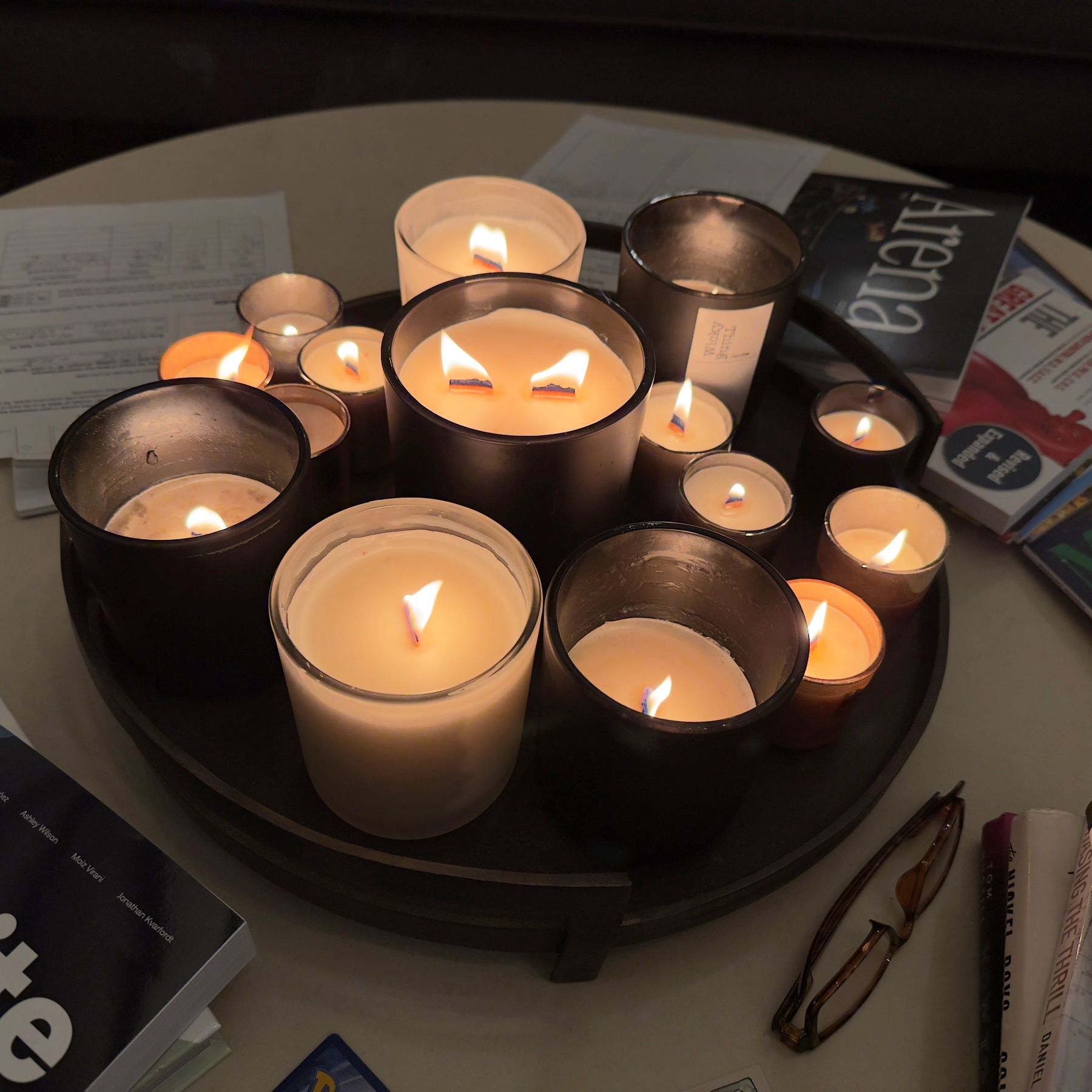 Burning this many wooden wick candles at once is actually pretty noisy —