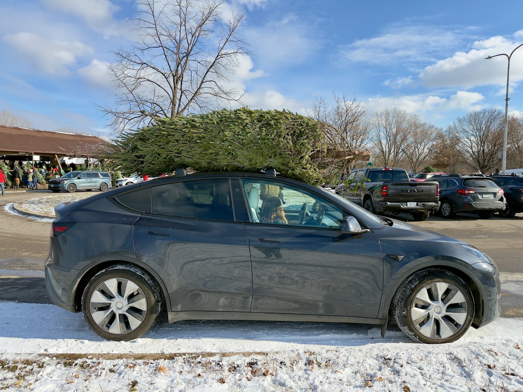 Wonderful 11 foot tree strapped to the top of the Model Y.