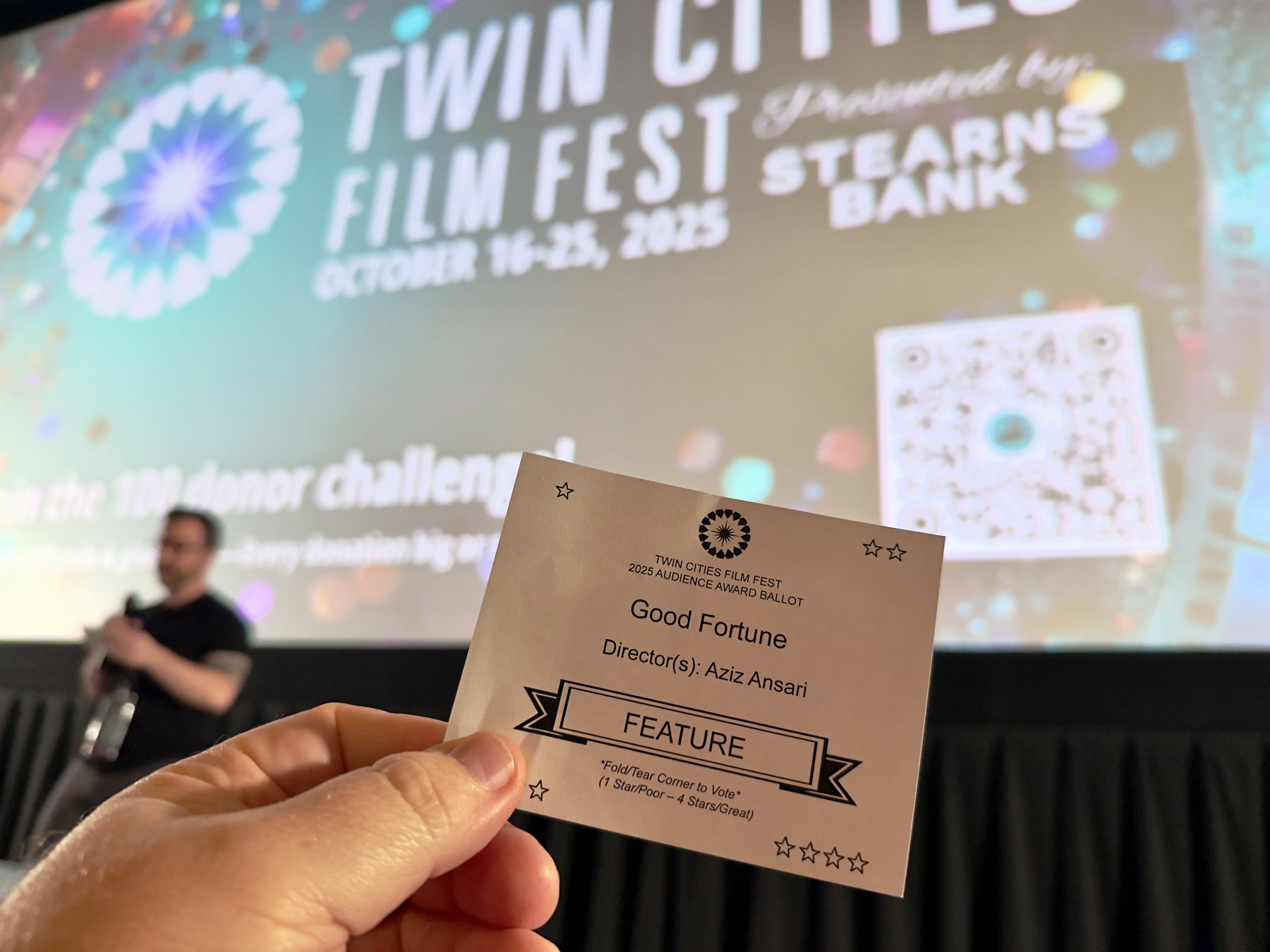 Tammy and I have went to the Twin Cities Film Fest showing of Good Fortune tonight at the Edina 4 theatre. It was our first time at a Film Fest event and we got to be all official and vote on the movie. Also, the Edina 4 theatre is just a great place to see a movie in general, but an even better place to see a movie during the Film Fest with tons of dining options nearby to make it a great evening.